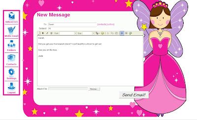 Then, I let her log into her account. She was so excited to have her own email address! She took right to the kid-friendly interface and sent me an email, finding lots of colors, fonts, and smileys to put in her note. (Kids today just seem to be able to figure this out instantly!) I was happy to see that the interface had a pink fairy on it - probably because I indicated that she was a girl - and didn't have any advertising that you see on so many other email provider sites.