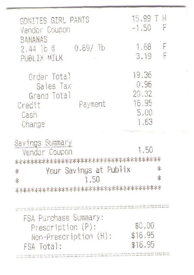 So I discovered this new savings method when I made a quick stop at Publix to pick up Goodnites, milk, and bananas. I had a $1.50 coupon off for the Goodnites. I decided to try using my FSA card to pay for the Goodnites and use cash for the milk and bananas. So here was my receipt: