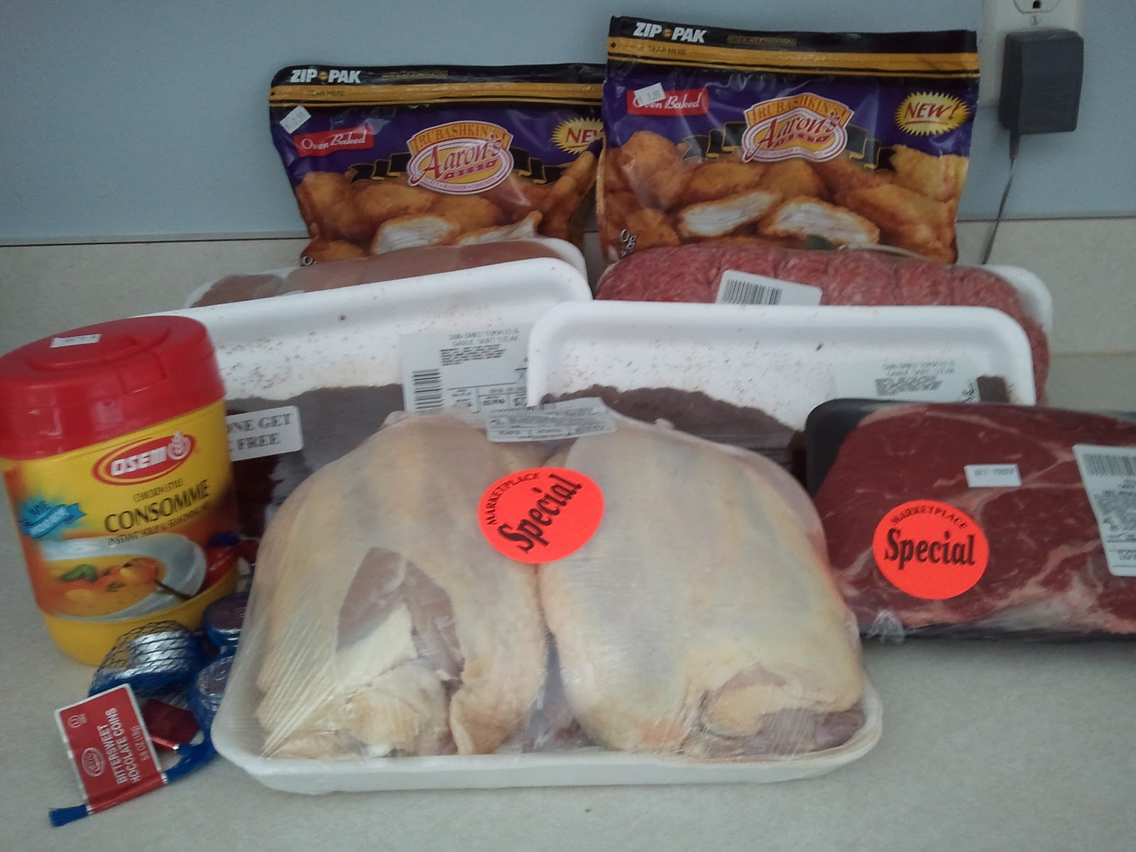 Yesterday, I spent $91.10 at the kosher butcher. And as you can see, I didn't get all that much. In the picture are two whole chickens, one 4-pound package of boneless chicken breasts, one 3.5-pound package of ground beef, two packages of chicken nuggets, two skirt steaks, one pot roast, one container of chicken bouillon, and three bags of Chanukah chocolate coins.