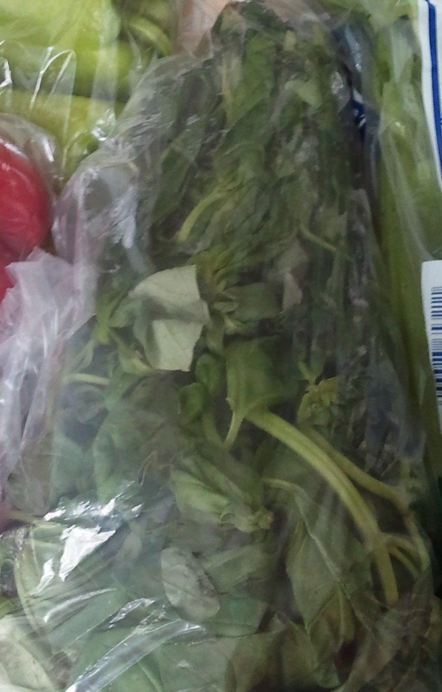 One of the items that enticed me was a very large bunch of basil, priced at $1.49. Stores in my area might sell such a bunch for twice that price, if at all. But on a bad note, the bunches were pretty wilted. I bought one anyway. To the right is what it looked like in the bag... pretty bad, no?