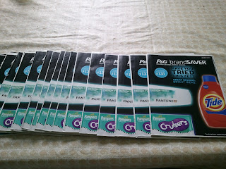 I decided to send the coupons from the 2/27 Procter & Gamble inserts to the troops. One thing that is great about the P&G inserts is that all of the coupons have the same expiration date - in this case, they all expired on 3/31. So I pulled out all of my inserts (I get them from a free weekly newspaper in my area) from my coupon file (I don't cut them up, but file by date), separated the individual pages out, and put each type of page into a pile. And then I started cutting.