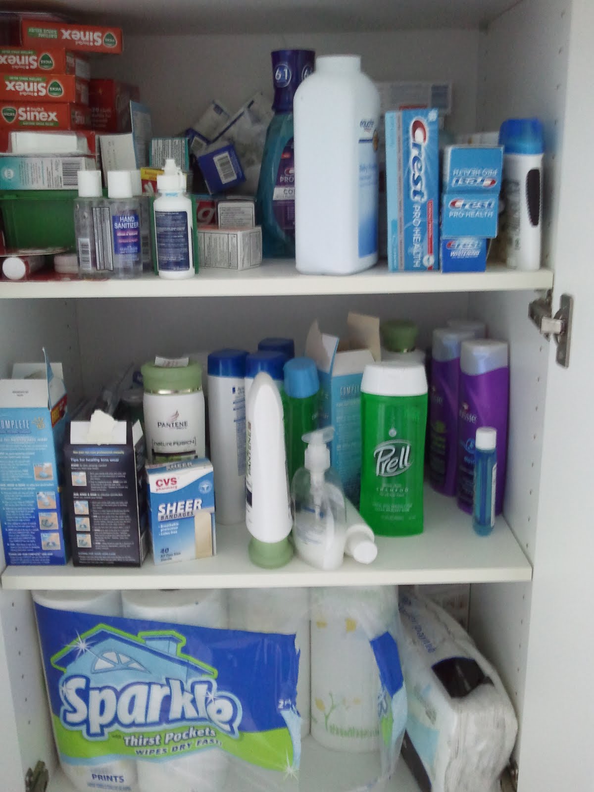 Most of the items are on the bottom three shelves of a floor-to-ceiling cabinet in my bathroom. The top three shelves hold linens and towels, cleaning supplies, and some lesser-used items. Here's a look - this was taken before I unshopped to donate to a women's shelter: