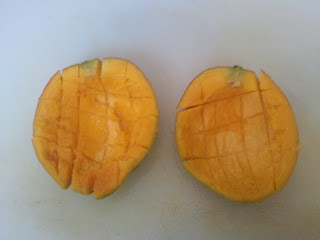 5. Cut the checkerboard into the four mango pieces as in step 5 above.