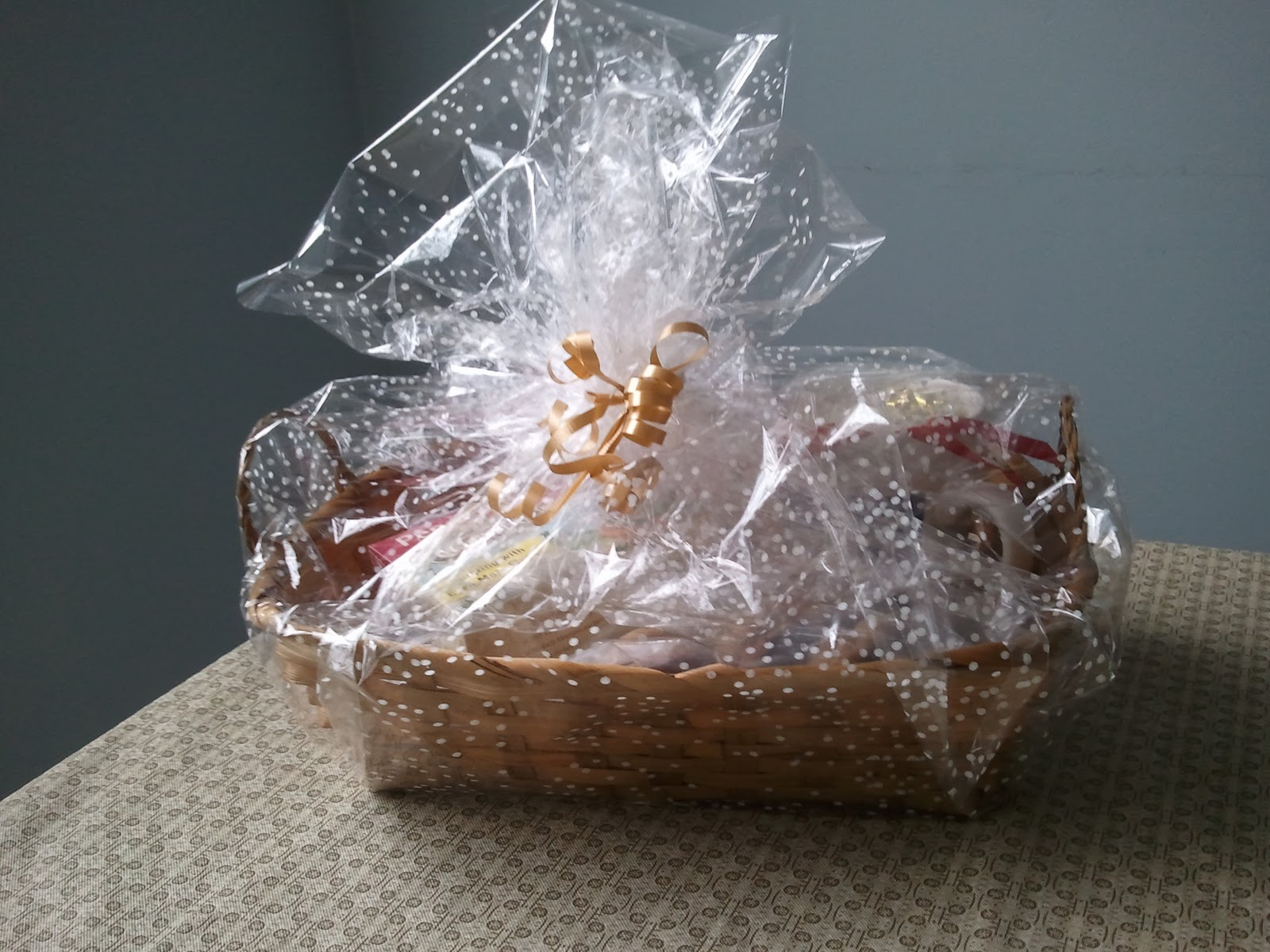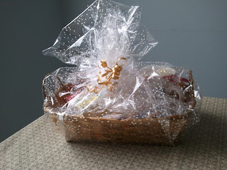 The completed basket had a box of tea, a mug filled with candy, and a bag of chocolate chip and white chocolate chip cookies. (The second set of cookies was made with the sugar cookie mix with white chocolate chips added in.) Decorative tissue paper was used to line the baskets, and the baskets were wrapped with cellophane wrap and tied with ribbon. Here's the final product: