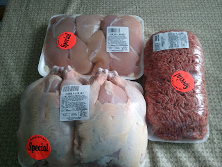 In my area the price I normally pay $1.99/lb for boneless/skinless chicken breast, $.89/lb for whole chickens, and never more than $2.49/lb for ground chuck. As a matter of fact I think my prices are too high and am always looking at ways to cut my cost. You have opened my eyes and made me more thankful for the cost I am paying...