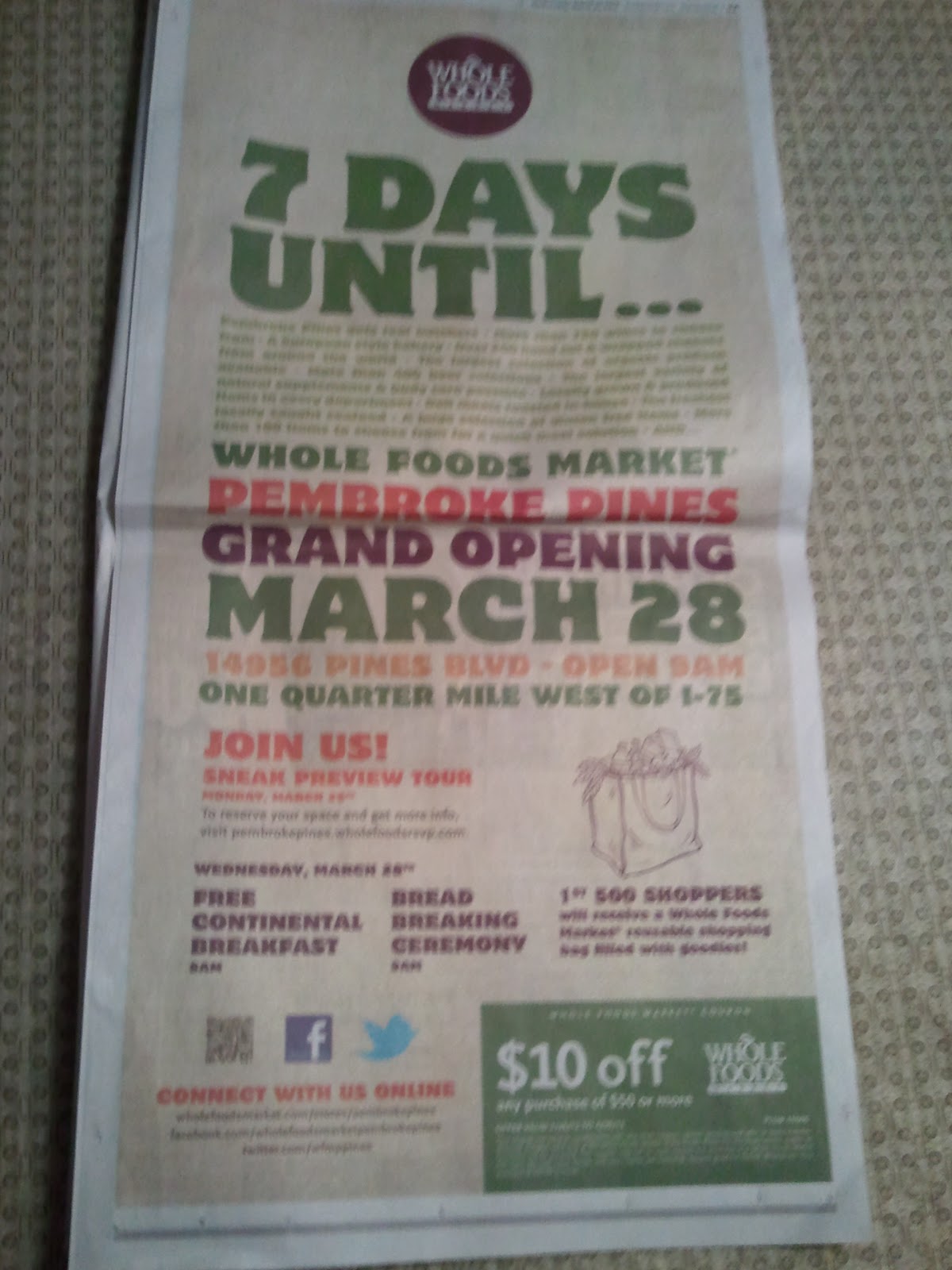 On page 9A of the March 21, 2012 newspaper, there is an ad for the new Whole Foods store in Pembroke Pines. There's a description of its grand opening on March 28th. And, most importantly, there is a coupon for $10 off a purchase of $50, good from 3/28 through 4/30.