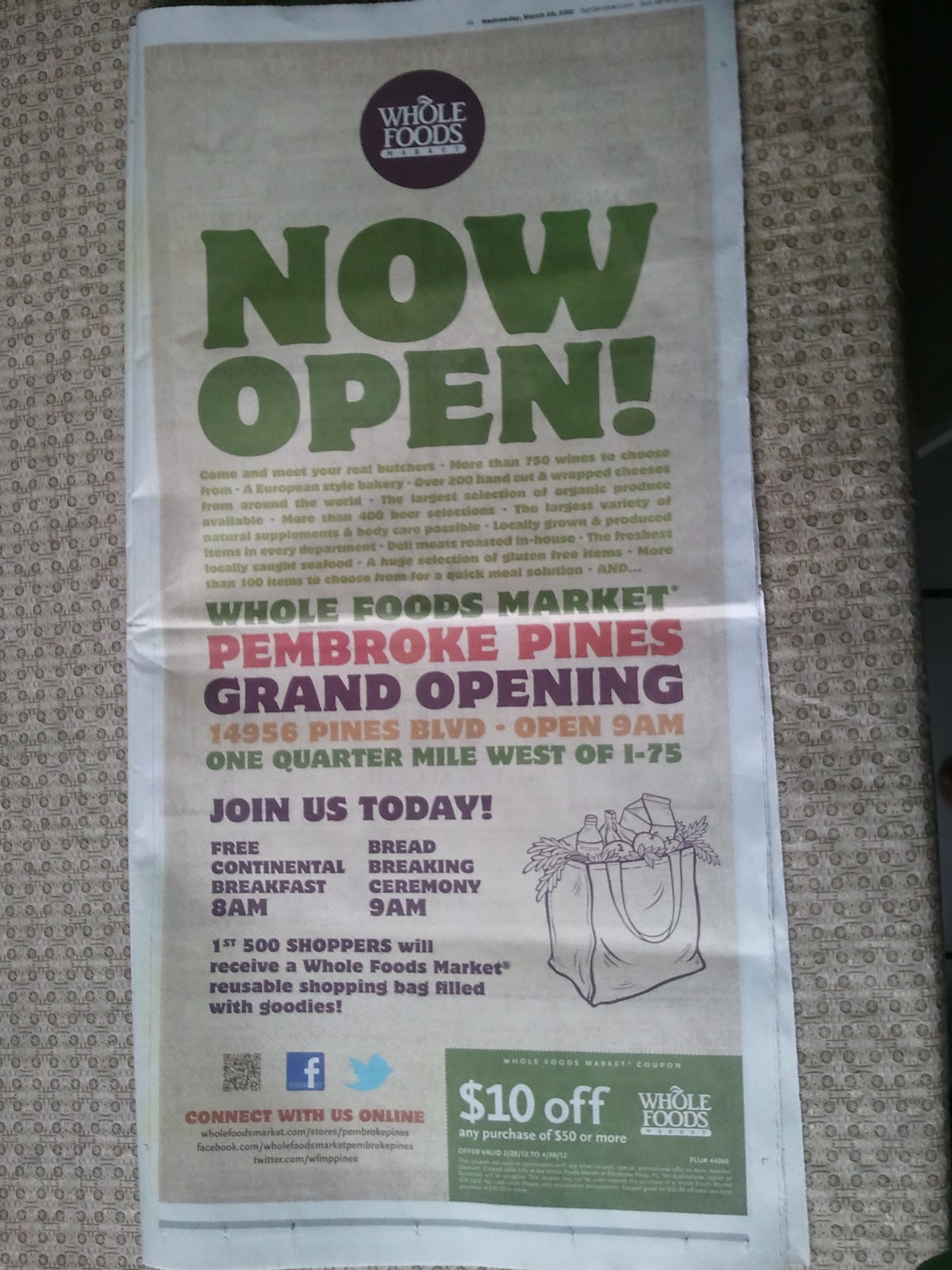 On page 11A of the March 28, 2012 newspaper, there is an ad for the new Whole Foods store in Pembroke Pines. There's a description of its grand opening today. And, most importantly, there is a coupon for $10 off a purchase of $50, good from today through 4/30.