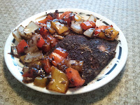 I also used the Ginger Teriyaki and Roasted Garlic Peppercorn rubs to make this delicious recipe. Besides being delicious, it was frugal as well! The salmon fillets were purchased at ALDI - 2 pounds for $7.99, a great price! The colored peppers and onions were also purchased at ALDI when they were on sale at the end of the produce aisle. And the tomatoes were purchased at Western Beef, where they were also on sale.
