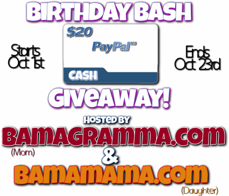 So coming October 1st our giveaway for $20 Cash via Paypal will start and we plan on ending it on the 23rd of October. Why this date you ask? Well it's a Birthday Bash for BamaMama.com & BamaGramma.com. The 23rd is the day right between our Birthdays! So what better day to end it!