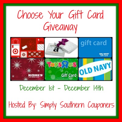 One lucky reader will choose their own Gift Card of choice! (Target, Walmart, Amazon, Kohl's, Old Navy or Toys R Us)