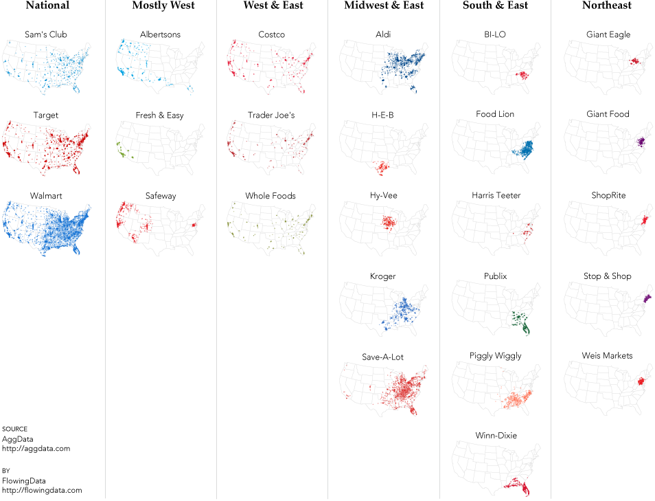 I found these interesting maps of the locations of various grocery stores throughout the contiguous 48 states in the US. The maps are pretty small here, so check out the whole story here.