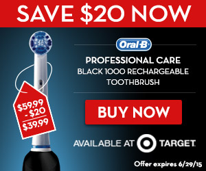 And you'll save $20! This HOT deal on the Oral-B Professional Care Black 1000 rechargeable toothbrush is only available for a very limited time! The offer is valid through 6/29/15 at Target. Plus, save $5 when you stock up on the 3-count refills pack at Target through 6/29/15.