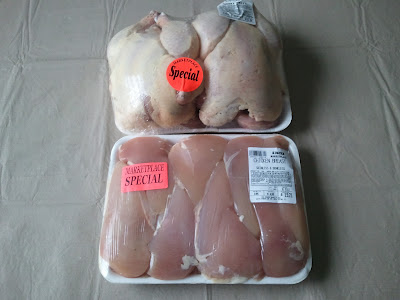 The next day, I went to the kosher supermarket to get some meat, as I was pretty much out! Yes, the prices are real - I haven't added an extra digit or two. Kosher meat is expensive because the animal feed is more expensive, there is more labor and time needed to kill and butcher the animal, the expense of shipping the meat from kosher butchering plants in the Midwest, and because there is simply lower demand for the meat.